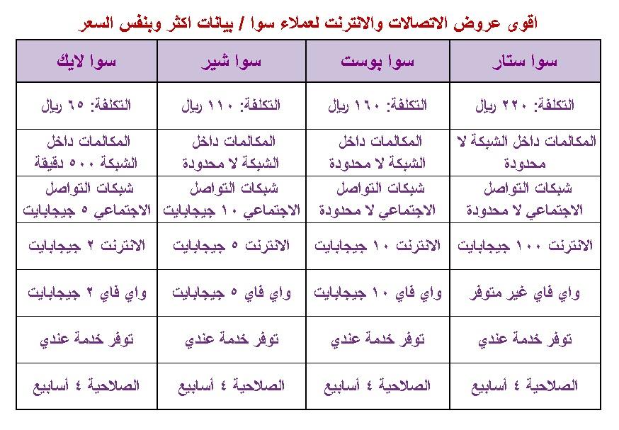 يمكنك الاطلاع على عروض بطاقة سوا مسبقة الدفع في الجدول أدناه: