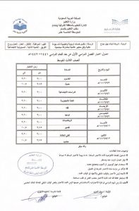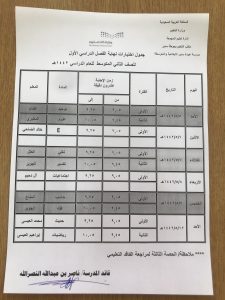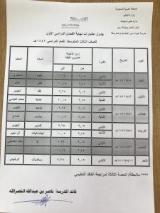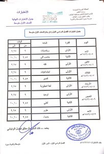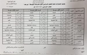 جدول امتحانات مجمع الشلايل التربوي المرحلة المتوسطة الفصل الأول
