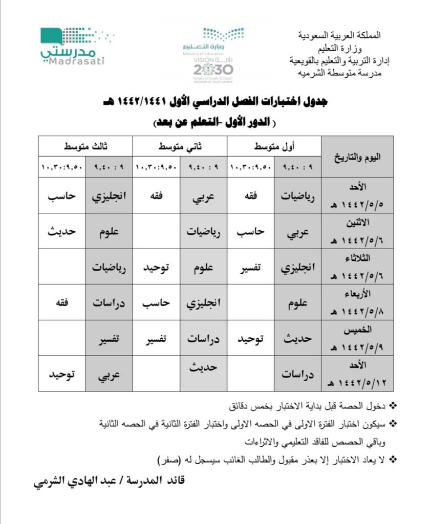 قالت مدرسة سديرة المتوسطة عن جدول الامتحانات للمرحلة المتوسطة للصفوف الاول والثاني والثالث المتوسط للفصل الدراسي الاول 1442 والبرنامج كالتالي: