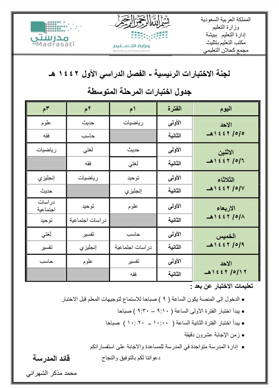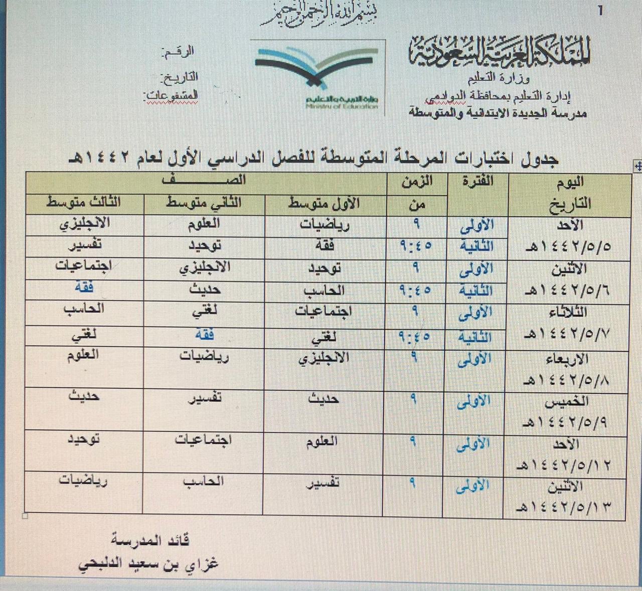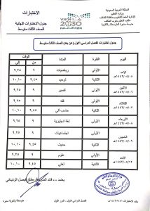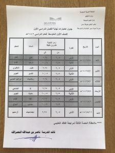صرحت مدرسة عودة سدير أن قائد المدرسة ناصر النصرالله قد وافق على جدول الامتحانات النهائية للفصل الدراسي الأول للمرحلة المتوسطة على موسوعة مدرستي أو المنصة المدرسية وأن على أولياء الأمور متابعة أطفالهم وجدول الامتحانات على النحو التالي: