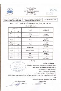 جدول امتحانات الفصل الدراسي الأول 1442 مدرسة سديرة المتوسطة