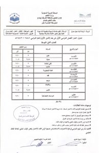 جدول امتحانات النصفي السنة الثالثة الفصل الأول 1442