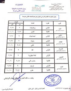 جدول امتحانات مدرسة الطفيل بن عمرو المتوسطة الفصل الأول من المرحلة الثانوية