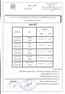 جدول امتحانات الصف الأول والثاني والثالث متوسط مدرسة العماجية