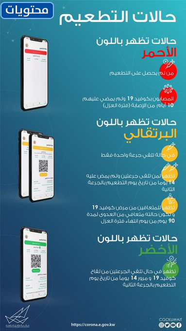 وتجدر الإشارة هنا لـ أن ممارسة “المناعة” تقسم الأشخاص لـ ثلاث فئات: الأخضر لمن تناولوا جرعتين من لقاح الكورونا ومرت 14 يومًا ، والأصفر هو الجرعة الأولى أو المصاب بالفيروس و 10 أيام. عاش (أكثر من 90 يومًا) وتم تطعيم الفئة الأخيرة باللون الأحمر لمن لم يصاب به أو أصيب بفيروس كورونا. لتوضيح ذلك ، يمكنك متابعة الرسم المرفق أدناه: