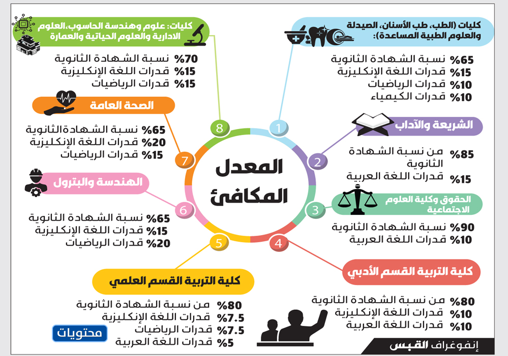 يمكنك حساب المعدل المعادل في مختلف التخصصات في جامعة الكويت بناءً على المعادلة الرياضية التي أخبرناك عنها للتو ، والتي يشرحها عميد القبول والقبول على أنها الحد الأدنى لمعدلات القبول في كليات الجامعة المختلفة وبالتالي ما يعادل الطالب.  سيتم احتساب المعدل وهذه النسب هي كما يلي: