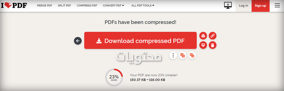 - لذلك ، سيبدأ الموقع في ضغط الملف ، وبعد ذلك ستظهر رسالة على الشاشة تفيد بأن ضغط الملف قد اكتمل ، ونسبة تصغير الملف وتقليل حجم الملف قبل وبعد وفي المثال الموضح الآن ؛ يتم ضغط الملف بنسبة 23٪ من 150.37 لـ 116 كيلوبايت.