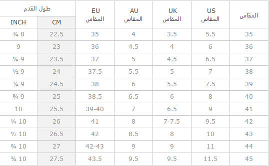 هذا العدد السابق الذي قد يدفع الكثير من الناس للاعتماد على هذه الجداول للوصول لـ اختيار مقاس الحذاء الصحيح والصحيح ، وفيما يلي سنعرض قائمة بأهم جدول مقاسات القدم للرجال أو النساء أو الأطفال بمزيد من التفصيل والتفصيل: