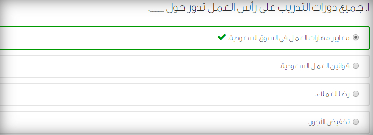 مقدمة في التدريب خلال العمل – تحوي دورة ojt حافزًا لمجموعة من الأسئلة التي ستساعد الطالب على فهم المادة العلمية المقدمة طوال الدورة. وبعد ذلك ، تحوي هذه الأسئلة دائمًا أنماط أسئلة الاختيار من متعدد لقياس درجة الفهم والحفظ والإدراك المرتبط بالتدريب ، وهنا يتم إذاعة السؤال وفيما يلي الاختبارات الأربعة التي يختارها المتدرب ، وفيما يلي حل بعض أسئلة الدورة. المكان الذي يتم فيه تحديد الإجابة الصحيحة عند الاختيار باللون الأخضر هو كما يلي: