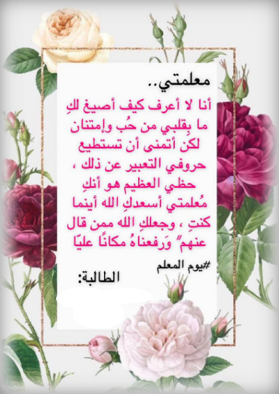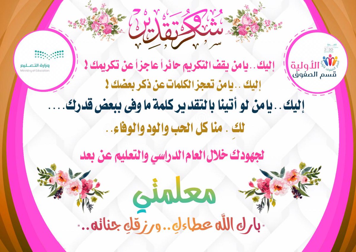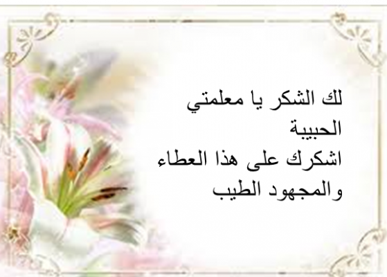 - عزيزي الأستاذ ، نحن طلاب فصلنا (________) ، نوفر أسمى معاني الفخر والتقدير والشكر لجهودك غير العادية والهائلة التي بذلتها معنا طوال العام الدراسي حتى نصل لـ شاطئ آمن. وقد توجت جهودك بالنجاح والتميز معنا.
