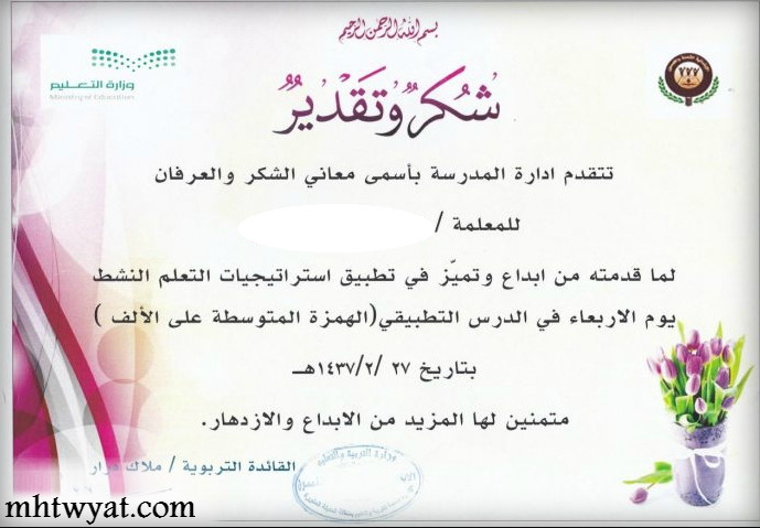 نموذج شهادة شكر وتقدير للمعلم الطبيب